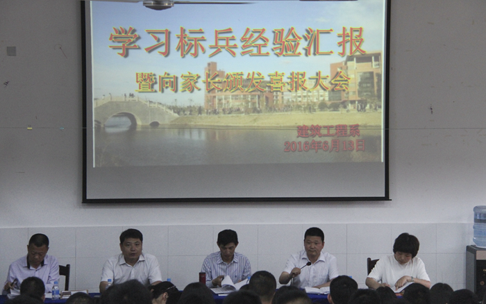 2016年6月13日下午,建筑工程系在二号教学楼9号阶梯教室召开了学习标兵经验汇报暨向家长代表颁发喜报大会,会议由周加林主任主持,学校过渡时期领导小组成员孙永龙教授出席,系部班主任和所有同学参加了大会。