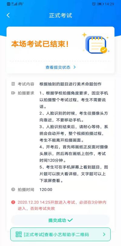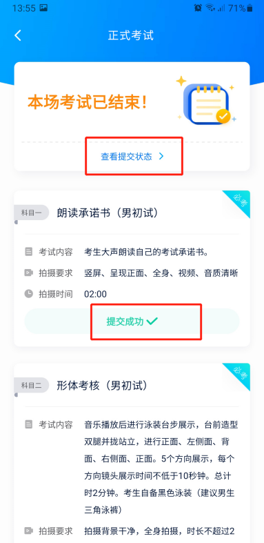 提交后,可以在“查看提交状态”里看到视频上传进度。提交成功或考试时间结束后,考试状态显示已结束。