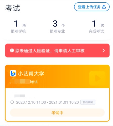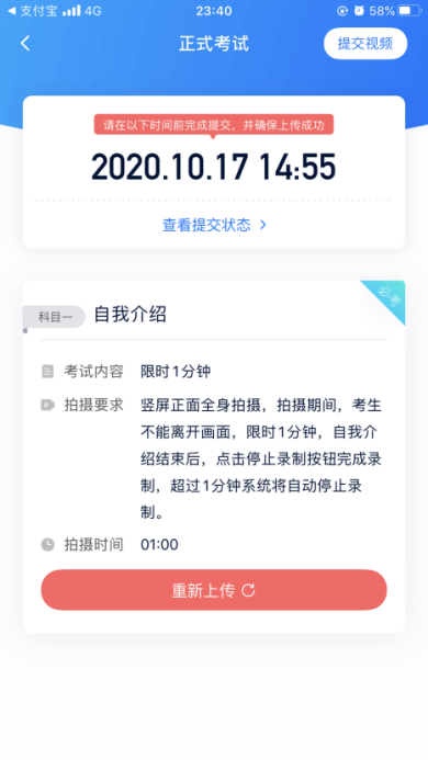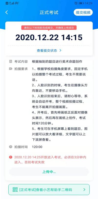 (2)考试视频全部提交后,请考生务必确认上传状态,不要退出小艺帮 APP。如果视频上传失败,我们会提醒您【重新上传】,请留意视频上传页或【考试】列表页底部,点击【重新上传】即可。您可以切换Wi-Fi和4G网络进行尝试。
