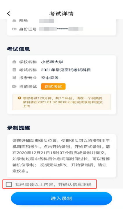 识别二维码后进入确认考试页面,请仔细确认“考生信息”、“考试信息”、“录制提醒”等内容,确认完成后勾选“我已阅读以上内容,并确认信息正确”,最后点击“进入录制”。