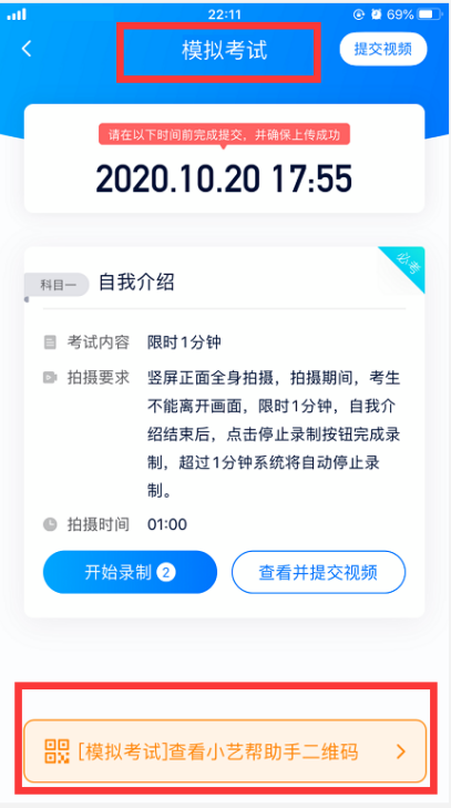 请按学校要求,提前架设好主机(小艺帮app)和辅机(小艺帮助手app)(摆放方法参照6.双机位摆放示意图),进入正式考试后,辅机先扫描主机位二维码,开启辅机位录制,详情见5.双机位考试(小艺帮助手app为辅机位)。面试科目有2次录制机会,录制按钮上会显示录制次数。每个科目只能提交1个视频,无须使用全部的录制机会。科目录制完毕后,可查看视频,并选择最合适的1个视频在考试时间截止前提交上传,作为考试视频。