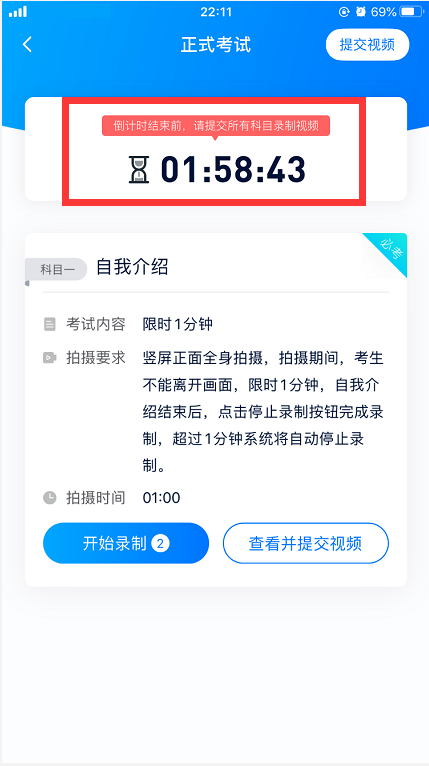 考试的页面上方为倒计时显示,如下图所示,请根据系统提示在规定时间内完成录制并提交视频。