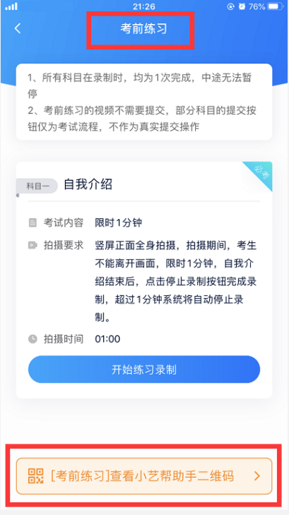 参加正式考试前务必要充分参加考前练习,以提前熟悉操作流程和考试流程。在考试详情页点击考前练习,允许访问麦克风及摄像头,请仔细阅读考试相关要求,根据要求进行练习录制,考前练习不限时间不限次数,也不需要提交录制视频。部分考试科目可提前结束录制,部分科目需要等待系统自动结束录制。