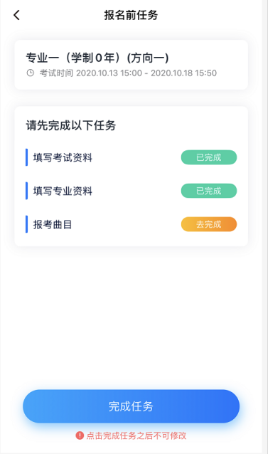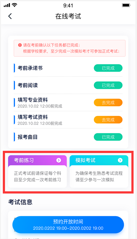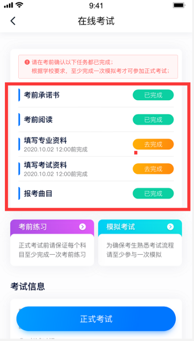在考试列表中点击对应考试进入,考前需完成屏幕上方考前任务,部分考前任务有时间限制,请在规定时间内完成,以免影响正式考试。