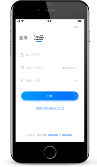打开app点击【注册】,输入手机号,点击发送验证码后填写,设置密码并牢记,点击注册。
