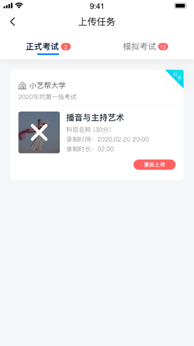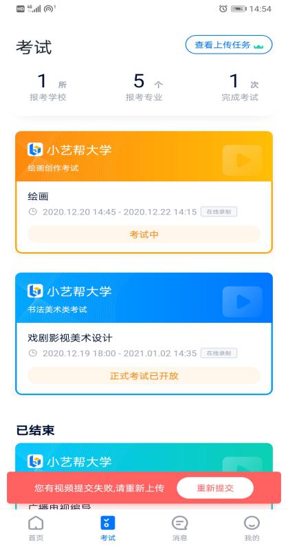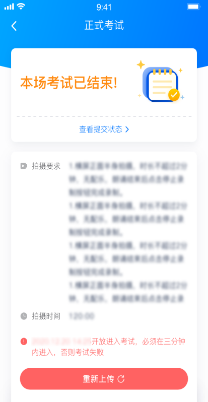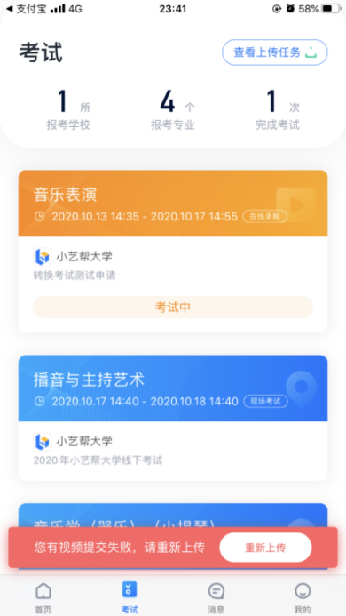 (2)考试视频全部提交后,请考生务必确认上传状态,不要退出小艺帮 APP。如果视频上传失败,我们会提醒您【重新上传】,请留意视频上传页或【考试】列表页底部,点击【重新上传】即可。您可以切换Wi-Fi和4G网络进行尝试。