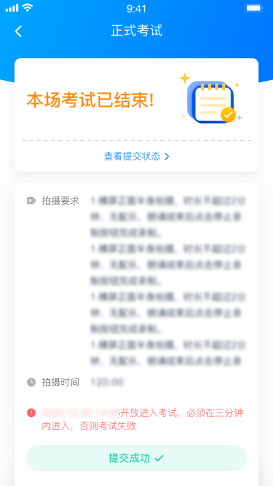 提交后,可以在“查看提交状态”里看到视频上传进度。提交成功或考试时间结束后,考试状态显示已结束。