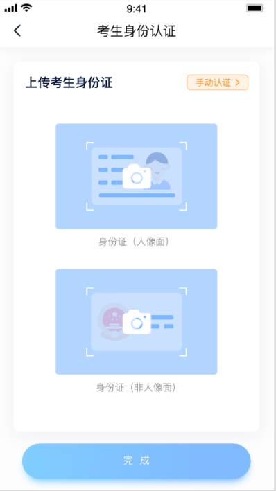 请认证考生身份证照片,按提示上传身份证人像面和国徽面,点击下一步,也可点击右上方手动认证,手动上传身份证信息,填写身份证上的信息进行识别,没有身份证请选择手动认证;港澳台侨及国际考生可选择护照或通行证认证。